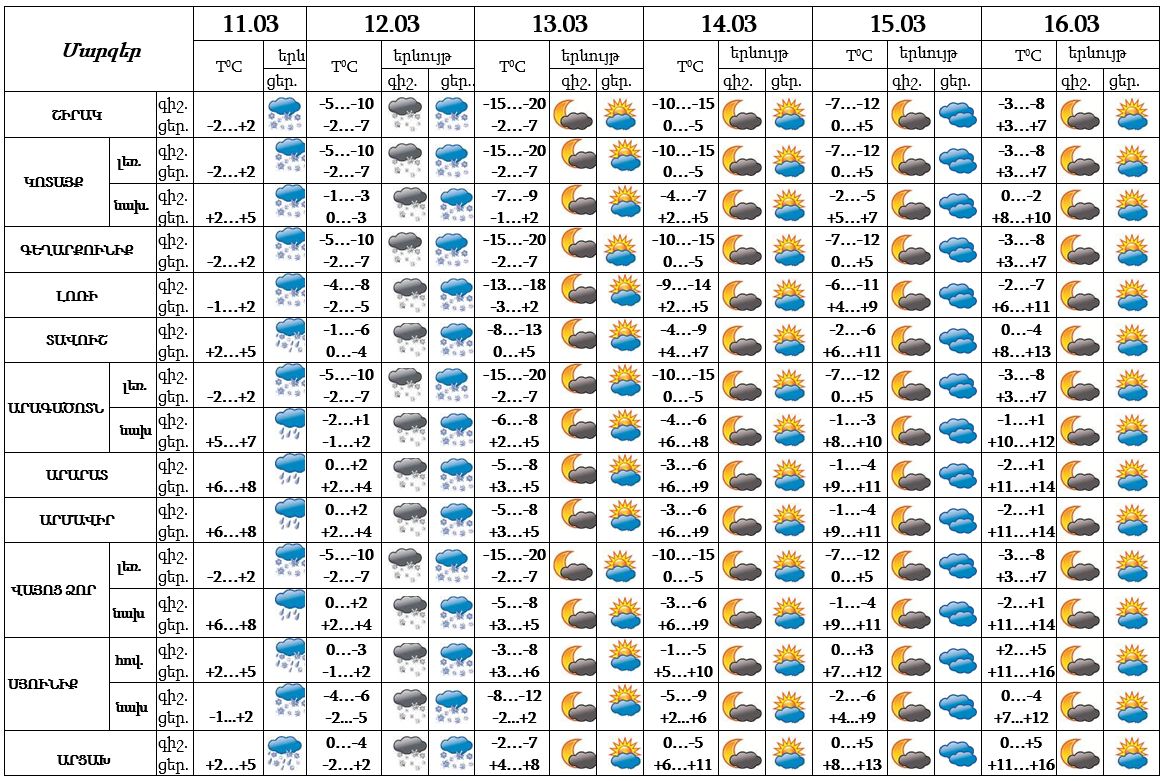 Մարտի 11-ի ցերեկը, 12-ին հանրապետության ողջ տարածքում սպասվում են տեղումներ, 11-ի ցերեկը՝ լեռնային և նախալեռնային շրջաններում, 12-ին՝ հանրապետության ողջ տարածքում ձյան տեսքով։ Մարտի 13-16-ին սպասվում է առանց տեղումների եղանակ:
