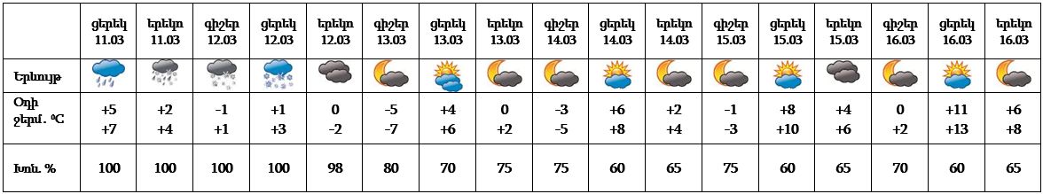 Մարտի 11-ի ցերեկը, 12-ին ժամանակ առ ժամանակ սպասվում են տեղումներ, 11-ի ցերեկը ձնախառն անձրև, 12-ին՝ ձյուն։ Մարտի 13-16-ը սպասվում է առանց տեղումների եղանակ: