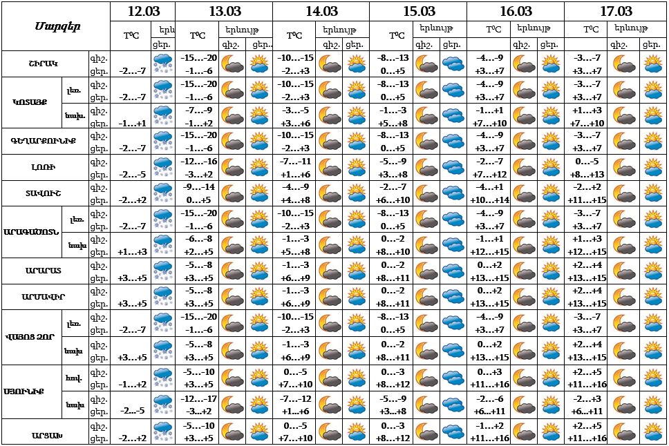 Մարտի 12-ի ցերեկը հանրապետության ողջ տարածքում սպասվում է ձյուն։ Մարտի 13-17-ը սպասվում է առանց տեղումների եղանակ: