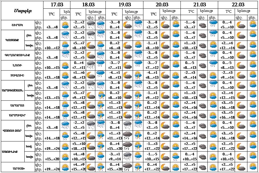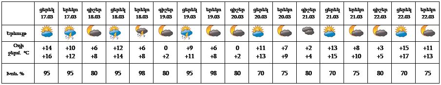 Մարտի 17-ի ցերեկը, 18-19-ը, 21-ի ցերեկը առանձին շրջաններում սպասվում են կարճատև տեղումներ, հնարավոր է ամպրոպ։ Մարտի 20-ին, 21-ի գիշերը, 22-ին սպասվում է առանց տեղումների եղանակ։