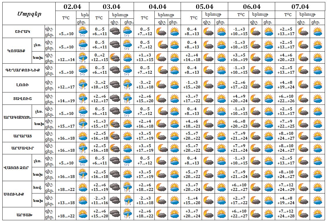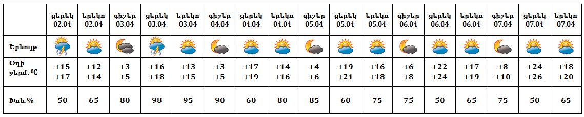 Ապրիլի 2-ի ցերեկը, 3-ին առանձին շրջաններում սպասվում են կարճատև տեղումներ, հնարավոր է ամպրոպ: Ապրիլի 4-7-ը սպասվում է առանց տեղումների եղանակ: