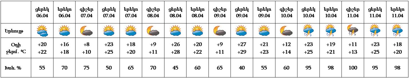 Ապրիլի 6-ի ցերեկը, 7-9-ը սպասվում է առանց տեղումների եղանակ, 10-11-ը սպասվում է կարճատև անձրև և ամպրոպ: