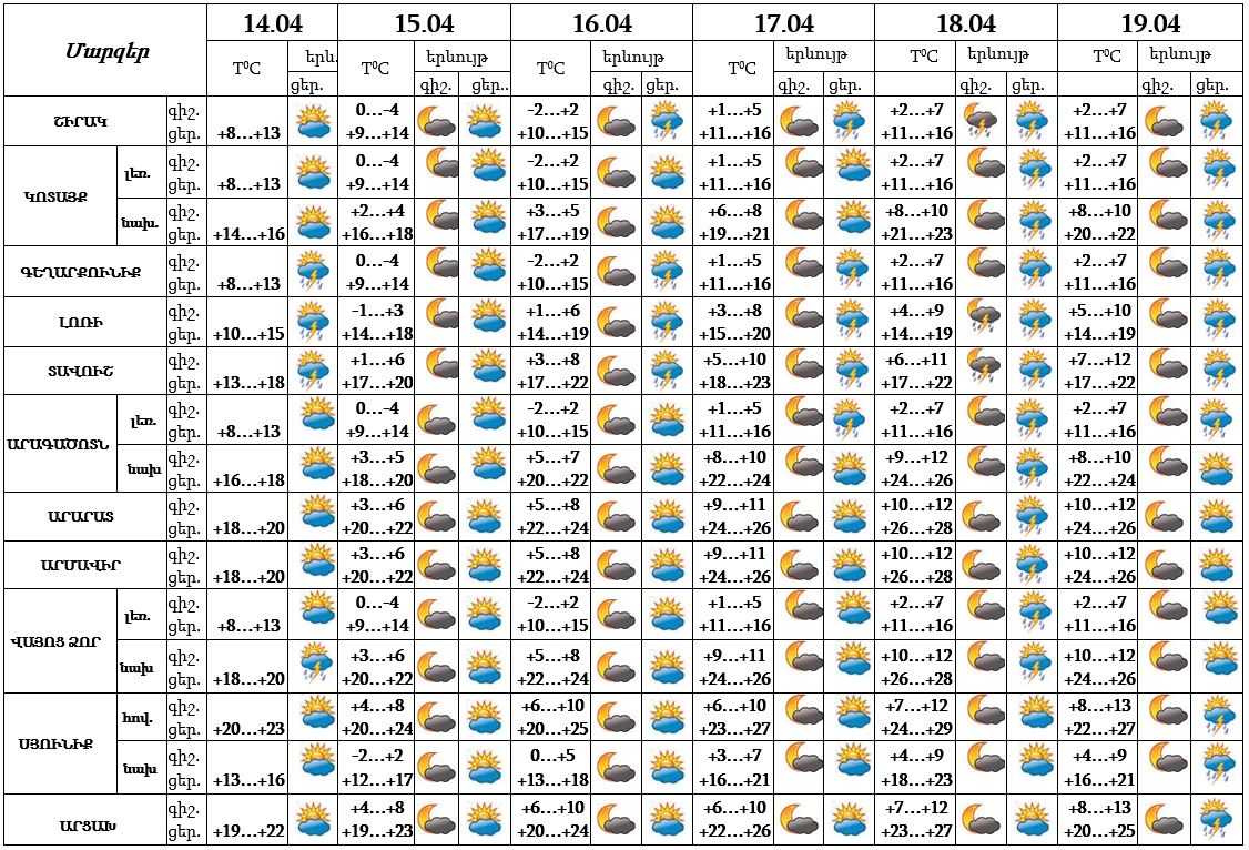 Ապրիլի 14-ի ցերեկը, 16-17-ը, 19-ին՝ հիմնականում կեսօրից հետո, առանձին շրջաններում, 18-ի ցերեկը շրջանների զգալի մասում սպասվում է կարճատև անձրև և ամպրոպ, ամպրոպի ժամանակ հնարավոր է քամու ուժգնացում՝ 15-20 մ/վ: Ապրիլի 15-ին սպասվում է առանց տեղումների եղանակ։