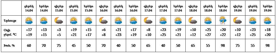 Ապրիլի 14-ի ցերեկը, 15-17-ը, 18-ի գիշերը և 19-ին սպասվում է առանց տեղումների եղանակ, 18-ի երեկոյան ժամերին քաղաքի առանձին հատվածներում հնարավոր է կարճատև անձրև և ամպրոպ: