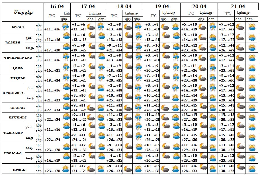Օդի ջերմաստիճանն ապրիլի 16-21-ը պայմանավորված հարավից տաք օդային հոսանքների ներթափանցմամբ աստիճանաբար կբարձրանա 10-12 աստիճանով: