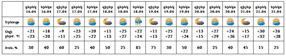 Ապրիլի 16-ի ցերեկը, 17-ին, 18-ի գիշերը, 19-21-ը սպասվում է առանց տեղումների եղանակ, 18-ի երեկոյան ժամերին քաղաքի առանձին հատվածներում հնարավոր է կարճատև անձրև և ամպրոպ: