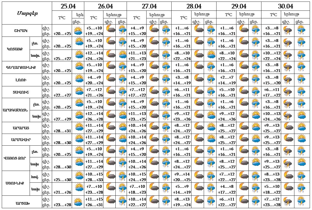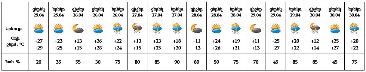 Ապրիլի 26-ին՝ կեսօրից հետո, 27-30-ը, մայիսի 1-ին՝ գիշերը և կեսօրից հետո սպասվում է կարճատև անձրև և ամպրոպ, ամպրոպի ժամանակ հնարավոր է քամու ուժգնացում մինչև 15-20 մ/վ: