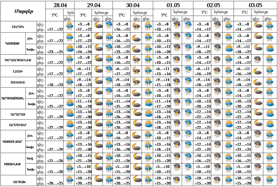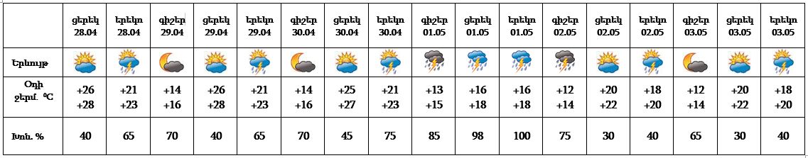 Ապրիլի 28-30-ը, մայիսի 2-3-ը կեսօրից հետո և գիշերը սպասվում է կարճատև անձրև և ամպրոպ: Մայիսի 1-ին ժամանակ առ ժամանակ սպասվում է անձրև և ամպրոպ, ամպրոպի ժամանակ հնարավոր է քամու ուժգնացում մինչև 15-20 մ/վ: