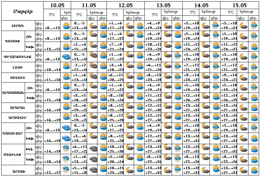Օդի ջերմաստիճանը մայիսի 10-ի ցերեկը կնվազի 6-8 աստիճանով, 11-14-ն աստիճանաբար կբարձրանա 8-10 աստիճանով: