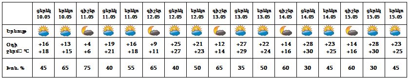 Մայիսի 10-ի ցերեկը, 11-12-ը սպասվում է առանց տեղումների եղանակ։ Մայիսի 13-15-ի ցերեկը առանձին շրջաններում սպասվում է կարճատև անձրև և ամպրոպ: Առանձին հատվածներում հնարավոր է կարկուտ։