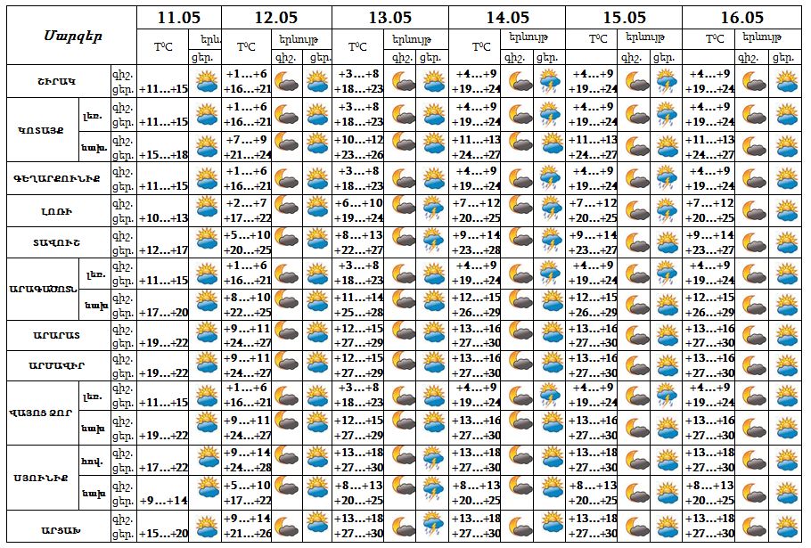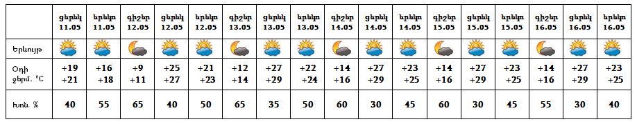 Մայիսի 11-ի ցերեկը, 12-ին, 16-ին սպասվում է առանց տեղումների եղանակ։ Մայիսի 13-15-ը` կեսօրից հետո, առանձին շրջաններում սպասվում է կարճատև անձրև և ամպրոպ: Առանձին հատվածներում հնարավոր է կարկուտ։