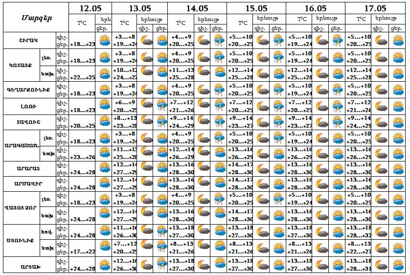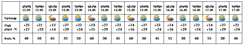 Մայիսի 12-ի ցերեկը, 17-ին սպասվում է առանց տեղումների եղանակ։ Մայիսի 13-16-ը` կեսօրից հետո, առանձին շրջաններում սպասվում է կարճատև անձրև և ամպրոպ: Առանձին հատվածներում հնարավոր է կարկուտ։