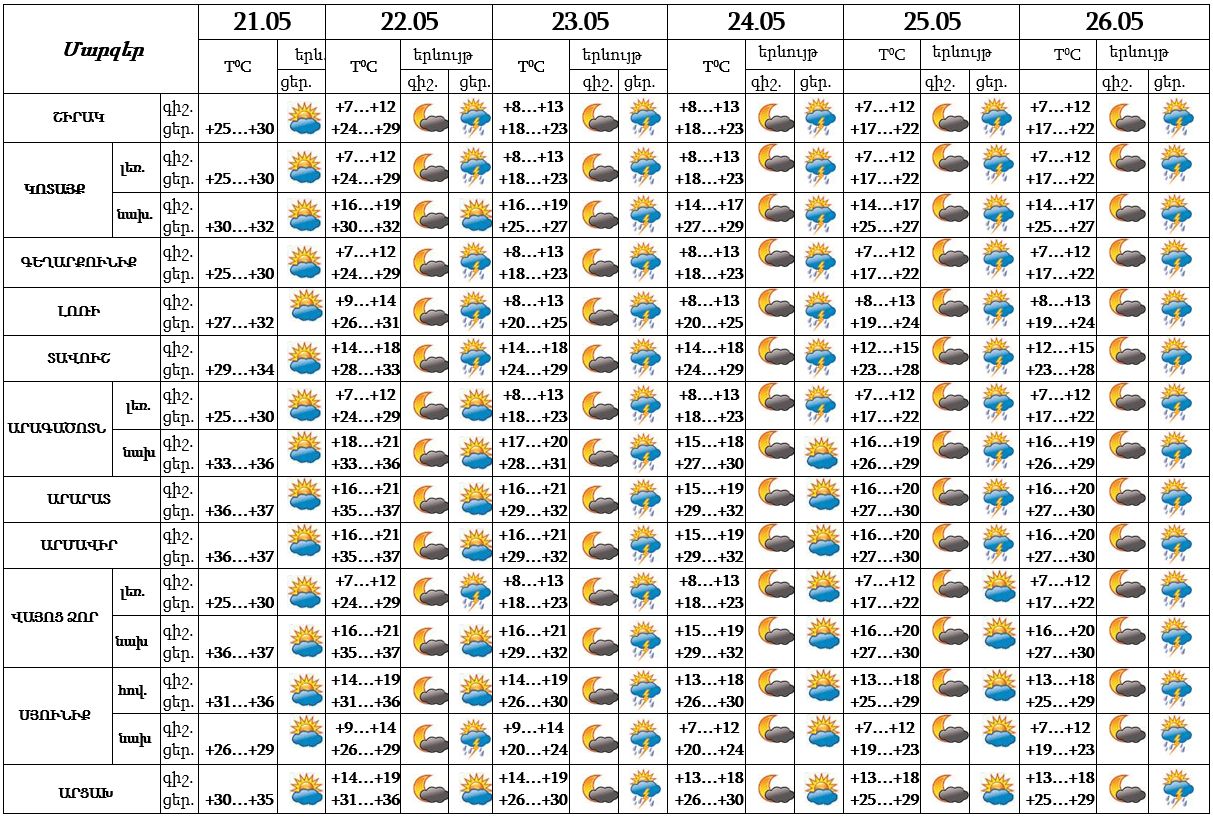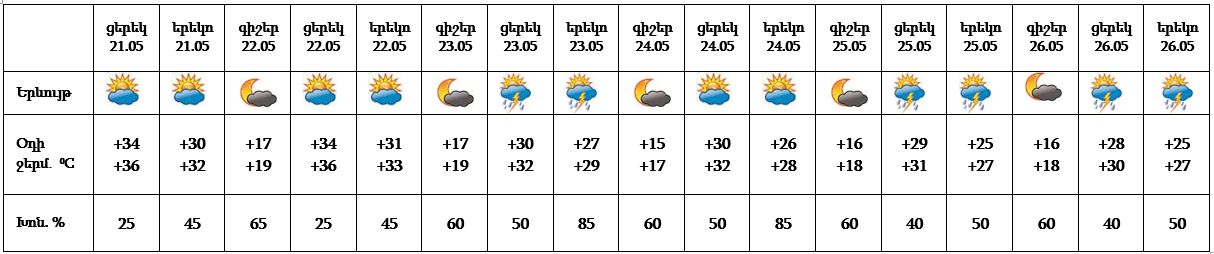 Մայիսի 21-ի ցերեկը և 22-ին սպասվում է առանց տեղումների եղանակ: Մայիսի 23-ին, 25-26-ի կեսօրից հետո սպասվում է անձրև և ամպրոպ: