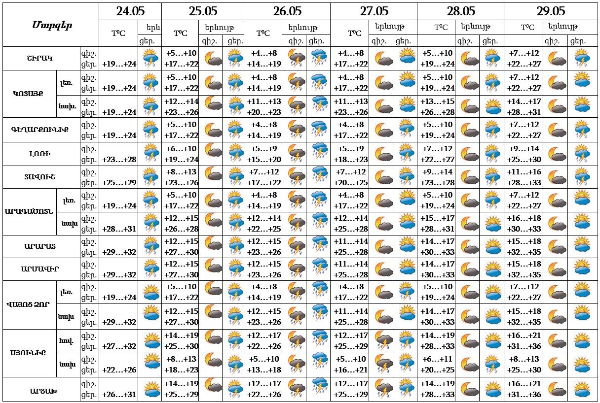 Օդի ջերմաստիճանը մայիսի 24-26-ի ցերեկն աստիճանաբար կնվազի 5-6 աստիճանով, 27-29-ն աստիճանաբար նույնքան կբարձրանա: