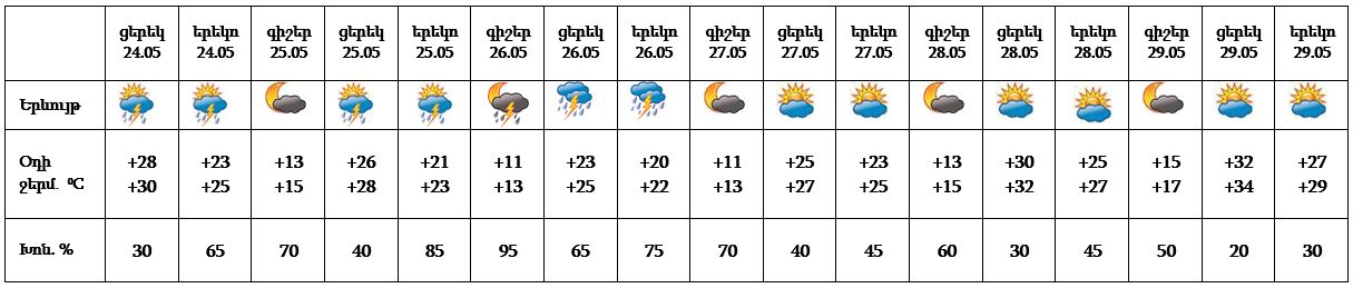 Մայիսի 24-ին՝ կեսօրից հետո, 25-26-ին՝ ժամանակ առ ժամանակ սպասվում է անձրև և ամպրոպ, ամպրոպի ժամանակ առանձին հատվածներում սպասվում է քամու ուժգնացում 15-20 մ/վ: Մայիսի 27-29-ին սպասվում է առանց տեղումների եղանակ: