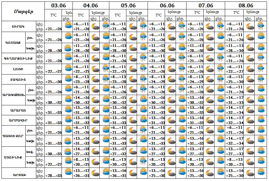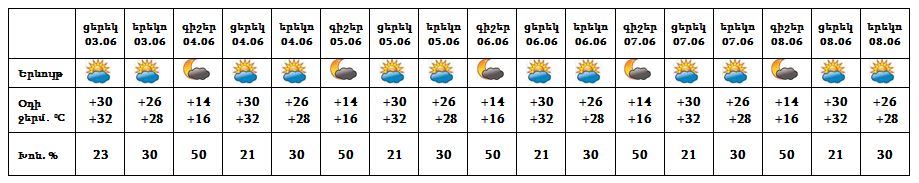 Հունիսի 3-ի ցերեկը սպասվում է առանց տեղումների եղանակ, 4-8-ի կեսօրից հետո առանձին շրջաններում սպասվում է կարճատև անձրև և ամպրոպ, առանձին հատվածներում հնարավոր է կարկուտ։
