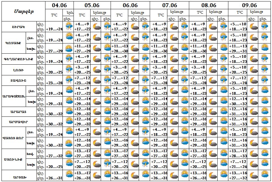 Հունիսի 4-ի ցերեկը, 5-9-ի կեսօրից հետո առանձին շրջաններում սպասվում է կարճատև անձրև և ամպրոպ, առանձին հատվածներում հնարավոր է կարկուտ։