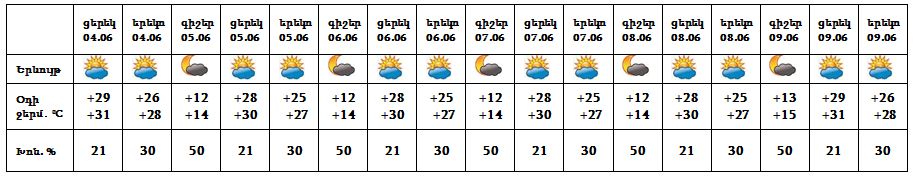 Հունիսի 4-ի ցերեկը, 5-9-ը սպասվում է առանց տեղումների եղանակ։