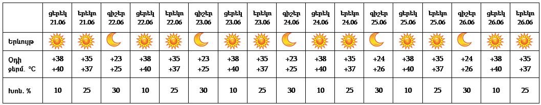 Պայմանավորված արաբական անապատներից արևադարձային տաք օդային հոսանքների ներթափանցմամբ հունիսի 21-26-ը հանրապետության ողջ տարածքում սպասվում է խիստ բարձր ջերմային ֆոն, Արարատյան դաշտում և նրա նախալեռներում, Վայոց Ձորի նախալեռներում, Սյունիքի հովտային գոտում և Երևանում ցերեկային ժամերին սպասվում է +39…+40 աստիճան։ Հունիսի 21-26-ը նշված գոտիներում սպասվում է նաև բարձր կարգի հրդեհավտանգ իրավիճակ: Ուլտրամանուշակագույն ճառագայթման ինտենսիվությունը սպասվում է նորմայից բարձր։ Խորհուրդ է տրվում ժամը 11։00-ից մինչև 17։00-ն ընկած ժամանակահատվածում խուսափել արևի ուղիղ ճառագայթներից։