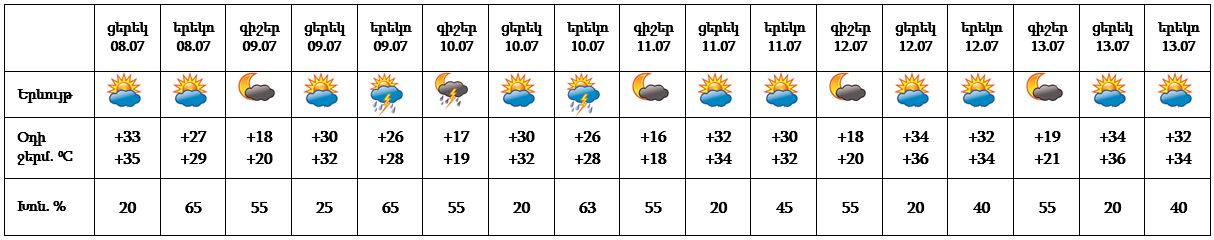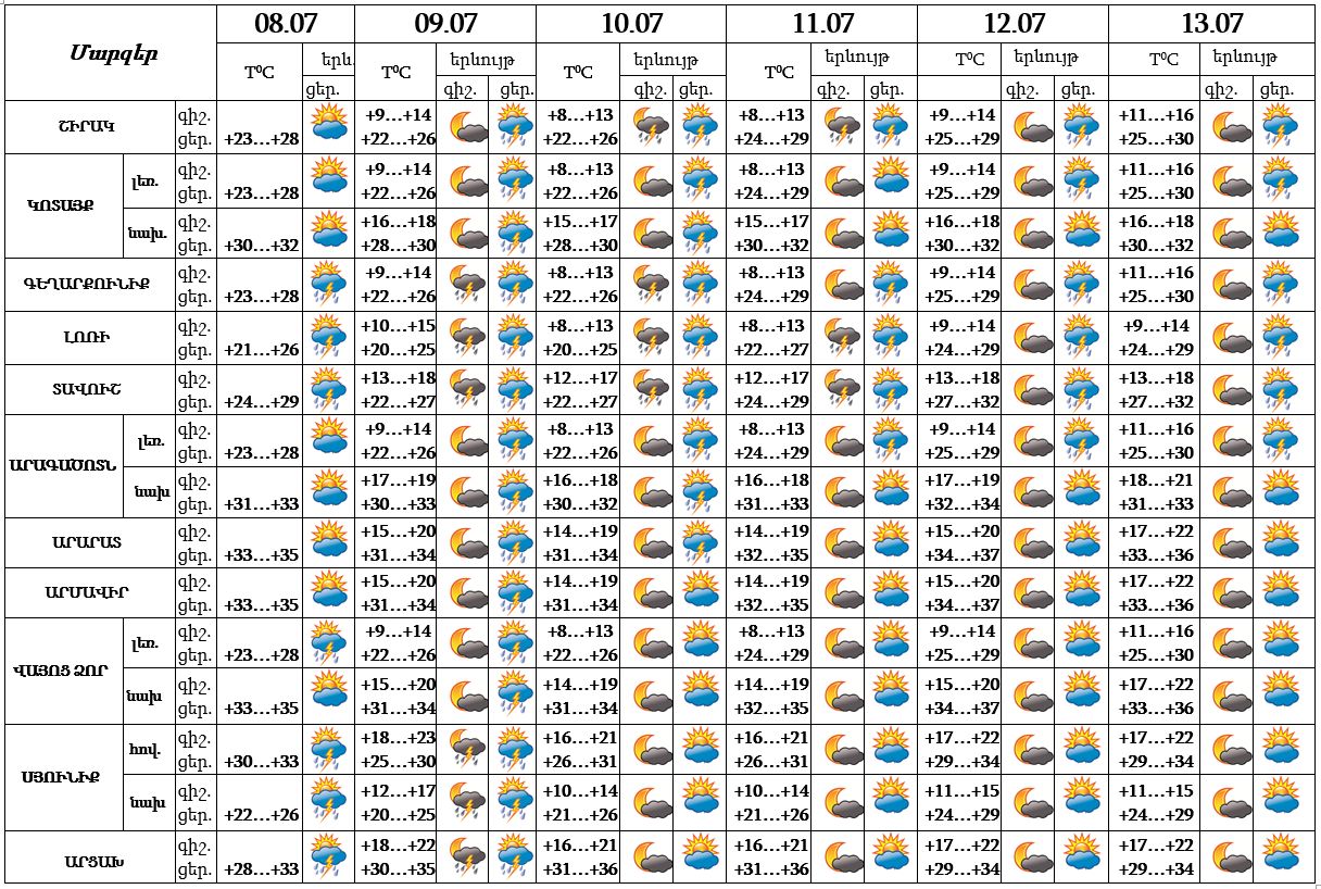 Օդի ջերմաստիճանը հուլիսի 9-ի ցերեկը կնվազի 2-3 աստիճանով, 11-13-ի ցերեկն աստիճանաբար կբարձրանա 3-5 աստիճանով։