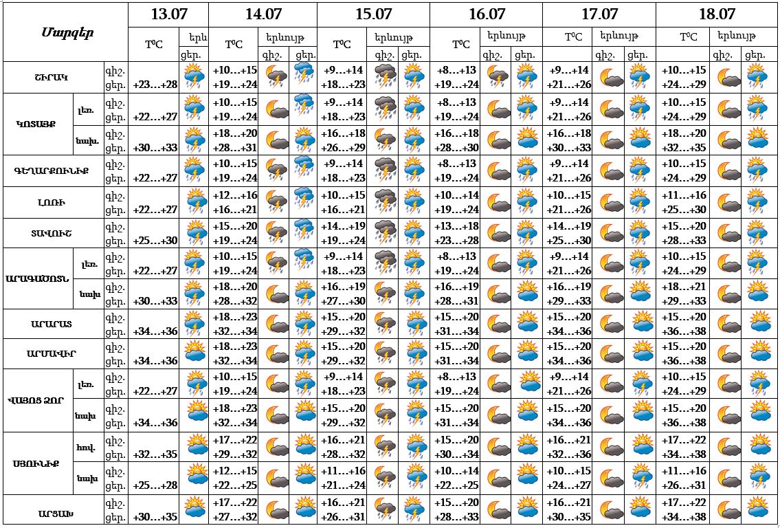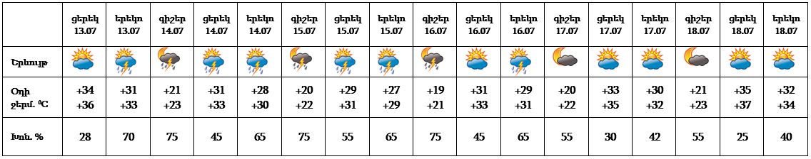 Հուլիսի 13-ին, 16-18-ը հիմնականում կեսօրից հետո և գիշերը՝ առանձին շրջաններում, 14-15-ին՝ շրջանների զգալի մասում սպասվում է անձրև և ամպրոպ, առանձին հատվածներում նաև կարկուտ։
