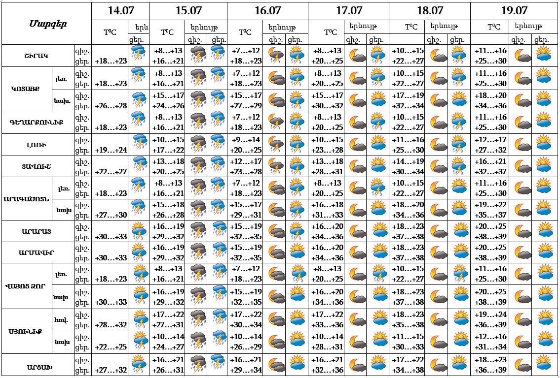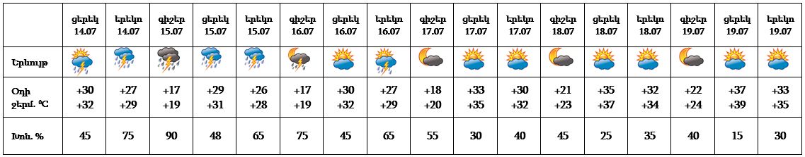 Հուլիսի 14-16-ը սպասվում է անձրև և ամպրոպ, ամպրոպի ժամանակ՝ քամու ուժգնացում 15-20 մ/վ: Հուլիսի 17-19-ը սպասվում է առանց տեղումների եղանակ:
