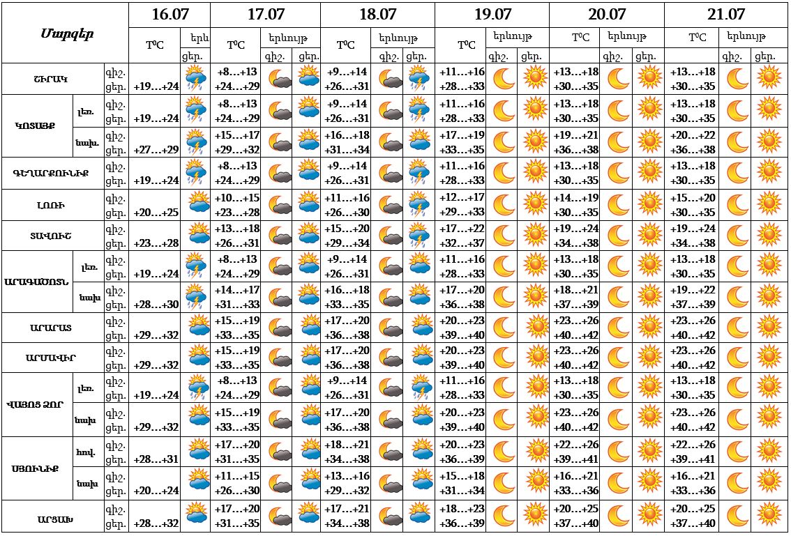 Սահարա անապատից արևադարձային տաք օդային հոսանքների ներթափանցմամբ պայմանավորված հուլիսի 16-20-ը հանրապետության ողջ տարածքում օդի ջերմաստիճանը աստիճանաբար կբարձրանա 14-16 աստիճանով, հուլիսի 19-20-ն Արարատյան դաշտում և նրա նախալեռներում, Վայոց Ձորի նախալեռներում, Սյունիքի հովտային շրջաններում և Երևանում ցերեկային ժամերին հասնելով +40․․․+42 աստիճանի։