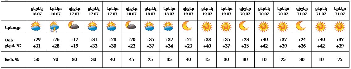 Հուլիսի 16-ի ցերեկը քաղաքի առանձին հատվածներում հնարավոր է կարճատև անձրև և ամպրոպ, ամպրոպի ժամանակ՝ քամու ուժգնացում 15-20 մ/վ։ Հուլիսի 17-21-ը սպասվում է առանց տեղումների եղանակ: