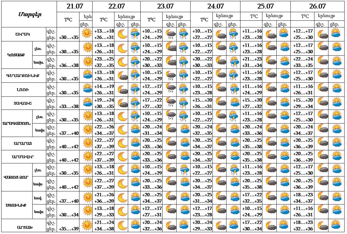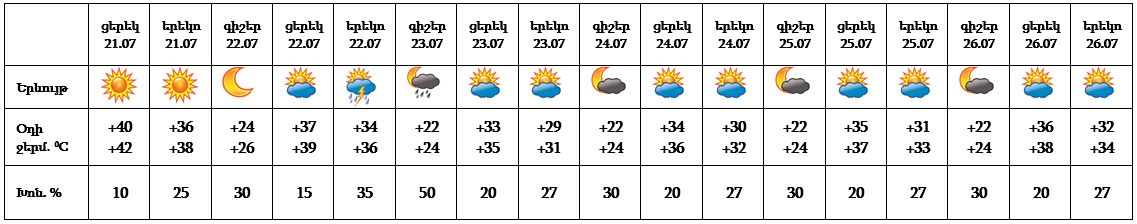 Հուլիսի 21-ի ցերեկը, 25-26-ը սպասվում է առանց տեղումների եղանակ: Հուլիսի 22-24-ը հիմնականում կեսօրից հետո առանձին շրջաններում սպասվում է անձրև և ամպրոպ, առանձին հատվածներում հնարավոր է նաև կարկուտ։