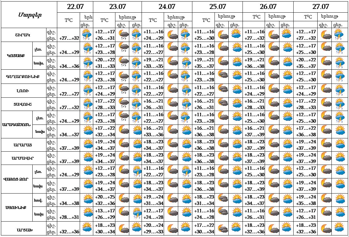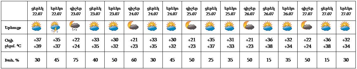 Օդի ջերմաստիճանը հուլիսի 22-24-ի ցերեկն աստիճանաբար կնվազի 5-7 աստիճանով, 25-26-ի ցերեկն աստիճանաբար կբարձրանա 2-3 աստիճանով։