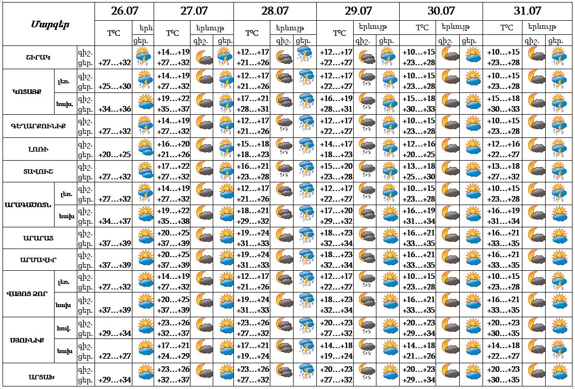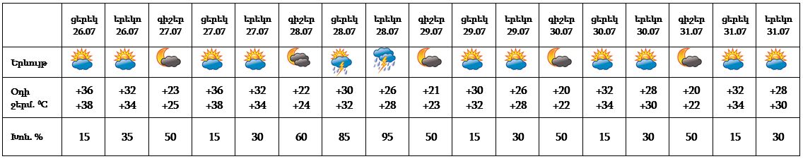 Հուլիսի 26-ի ցերեկը, 27-ին, 29-31-ը սպասվում է առանց տեղումների եղանակ: Հուլիսի 28-ին՝ կեսօրից հետո սպասվում է անձրև և ամպրոպ, ամպրոպի ժամանակ հնարավոր է քամու ուժգնացում 18-20 մ/վ արագությամբ:
