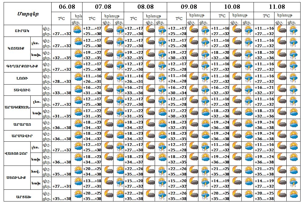 Օգոստոսի 6-ի ցերեկը սպասվում է առանց տեղումների եղանակ, 7-11-ի կեսօրից հետո առանձին շրջաններում սպասվում է անձրև և ամպրոպ, առանձին հատվածներում հնարավոր է նաև կարկուտ։