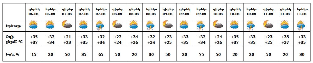 Օգոստոսի 6-ին սպասվում է առանց տեղումների եղանակ, 7-11-ի երեկոյան ժամերին առանձին հատվածներում սպասվում է կարճատև անձրև և ամպրոպ, ամպրոպի ժամանակ հնարավոր է քամու ուժգնացում` 18-20 մ/վ արագությամբ: