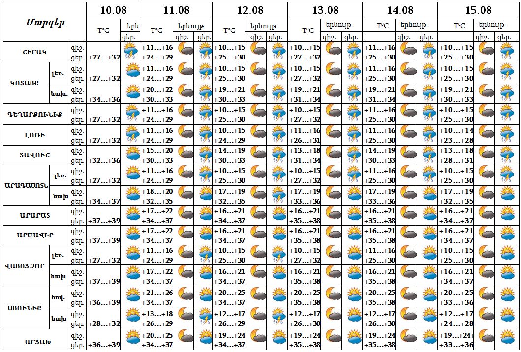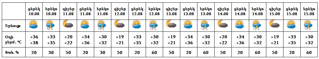 Օգոստոսի 10-15-ն առանձին շրջաններում կեսօրից հետո և գիշերը սպասվում է կարճատև անձրև և ամպրոպ, առանձին հատվածներում հնարավոր է նաև կարկուտ: