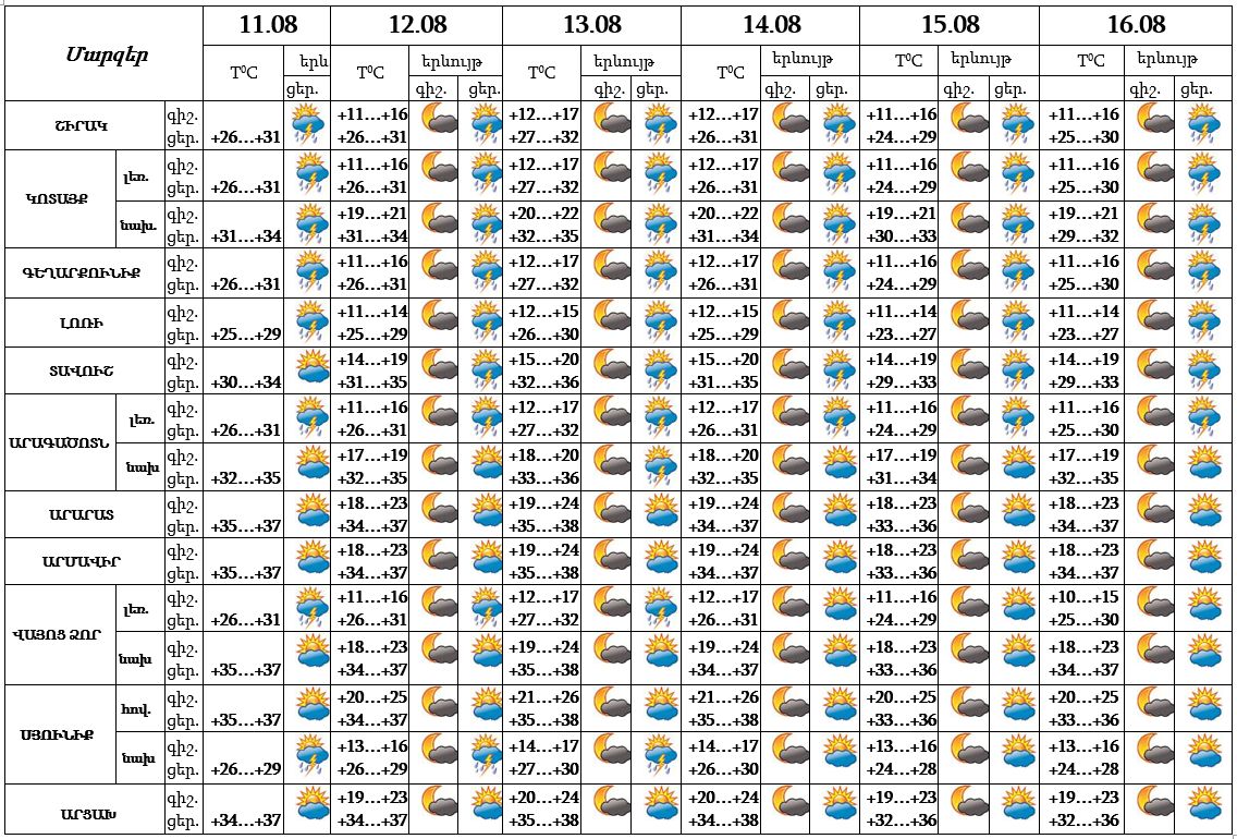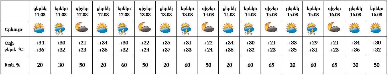 Օգոստոսի 11-16-ն առանձին շրջաններում կեսօրից հետո և գիշերը սպասվում է կարճատև անձրև և ամպրոպ, առանձին հատվածներում հնարավոր է նաև կարկուտ։