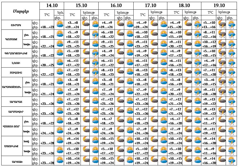 Հոկտեմբերի 14-ի ցերեկը, 15-18-ը սպասվում է առանց տեղումների եղանակ, 19-ին սպասվում է անձրև և ամպրոպ: