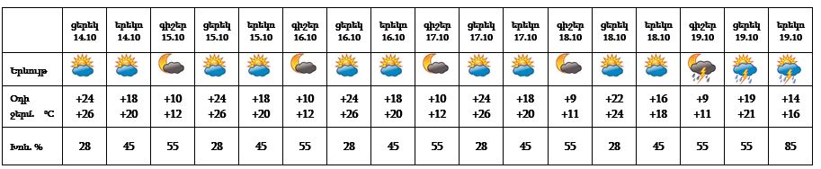 Հոկտեմբերի 14-ի ցերեկը, 16-17-ը, 18-ի գիշերը սպասվում է առանց տեղումների եղանակ, 15-ի և 18-ի ցերեկը, 19-ի գիշերը առանձին շրջաններում, 19-ի ցերեկը շրջանների զգալի մասում սպասվում է անձրև և ամպրոպ։