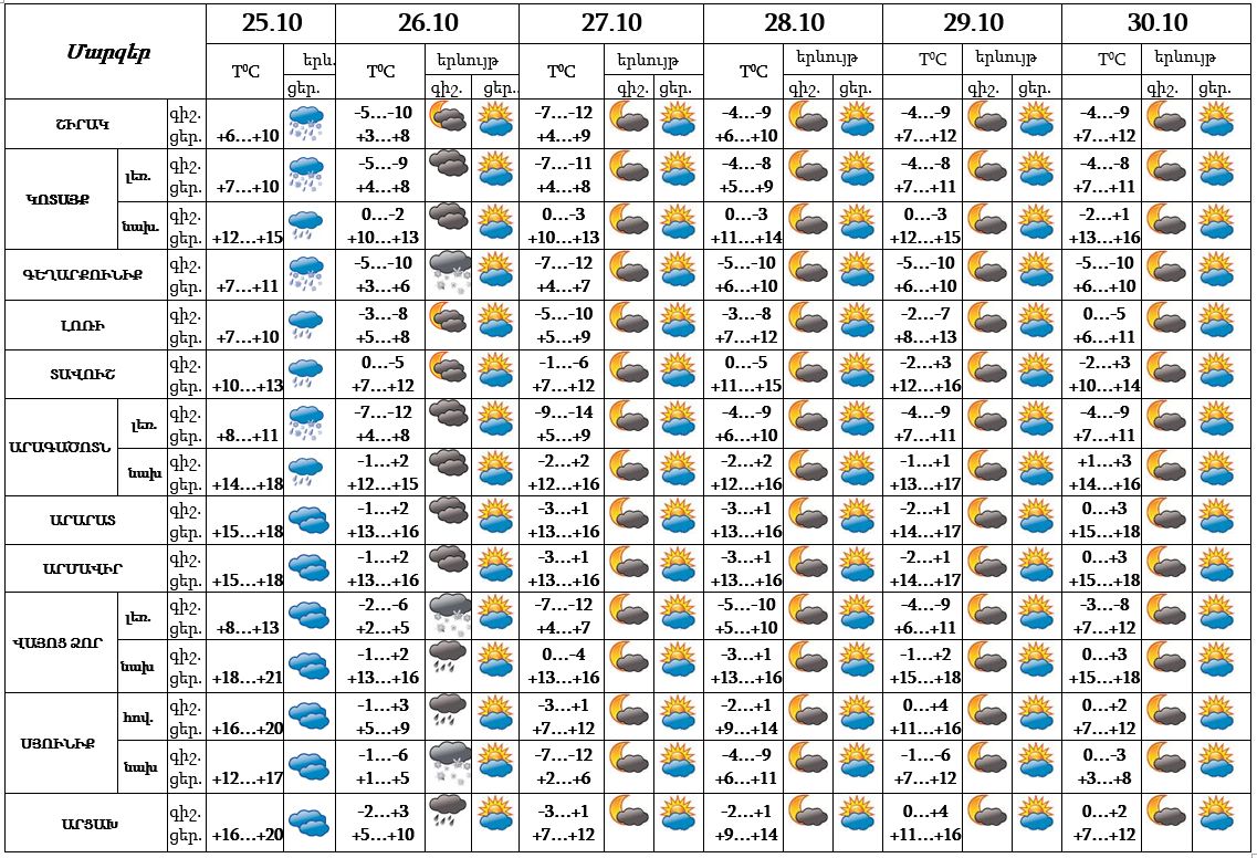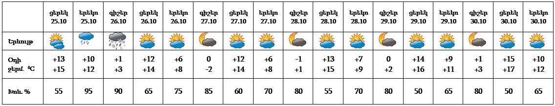 Հոկտեմբերի 25-ին կեսօրից հետո, 26-ի գիշերը առանձին շրջաններում սպասվում են տեղումներ, լեռնային և նախալեռնային շրջաններում ձյան տեսքով: Հոկտեմբերի 27-30-ը սպասվում է առանց տեղումների եղանակ: