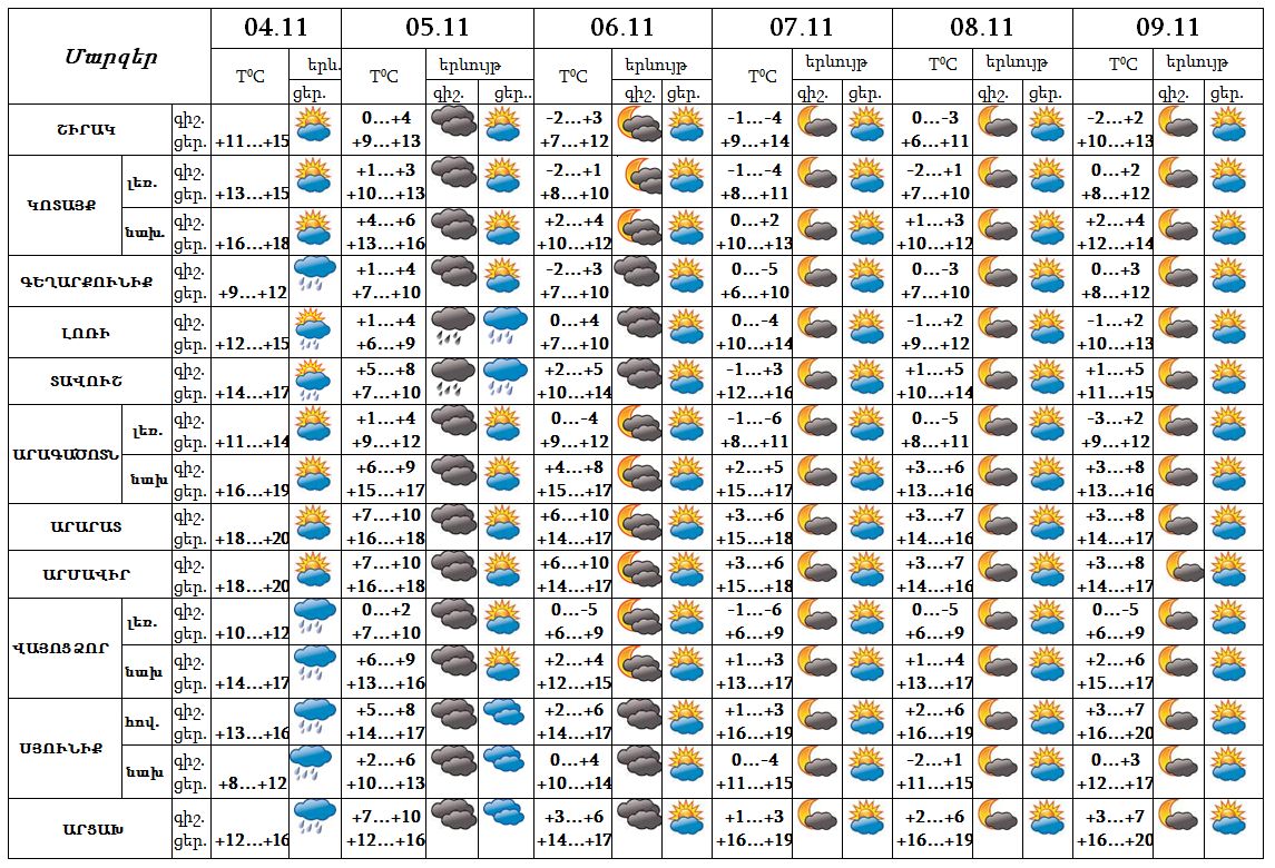 Նոյեմբերի 4-ի ցերեկը, 5-ին առանձին շրջաններում սպասվում են տեղումներ: Նոյեմբերի 6-9-ը սպասվում է առանց տեղումների եղանակ: