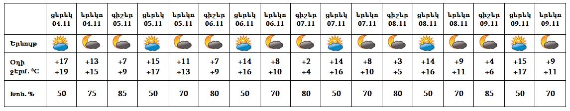 Նոյեմբերի 4-ի ցերեկը, 5-9-ը սպասվում է առանց տեղումների եղանակ։