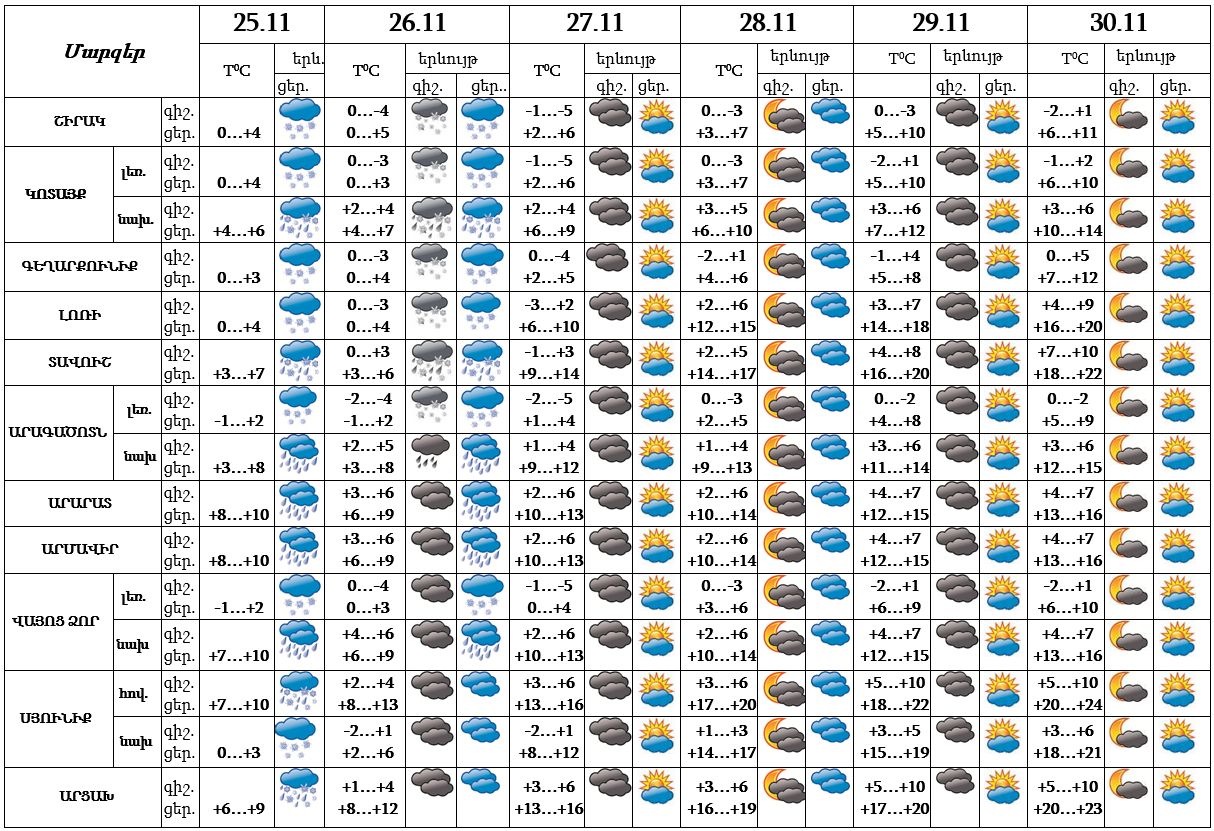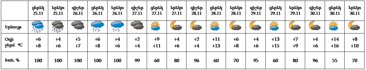 Նոյեմբերի 25-ի ցերեկը, 26-ին սպասվում է անձրև: Նոյեմբերի 27-30-ը սպասվում է առանց տեղումների եղանակ: