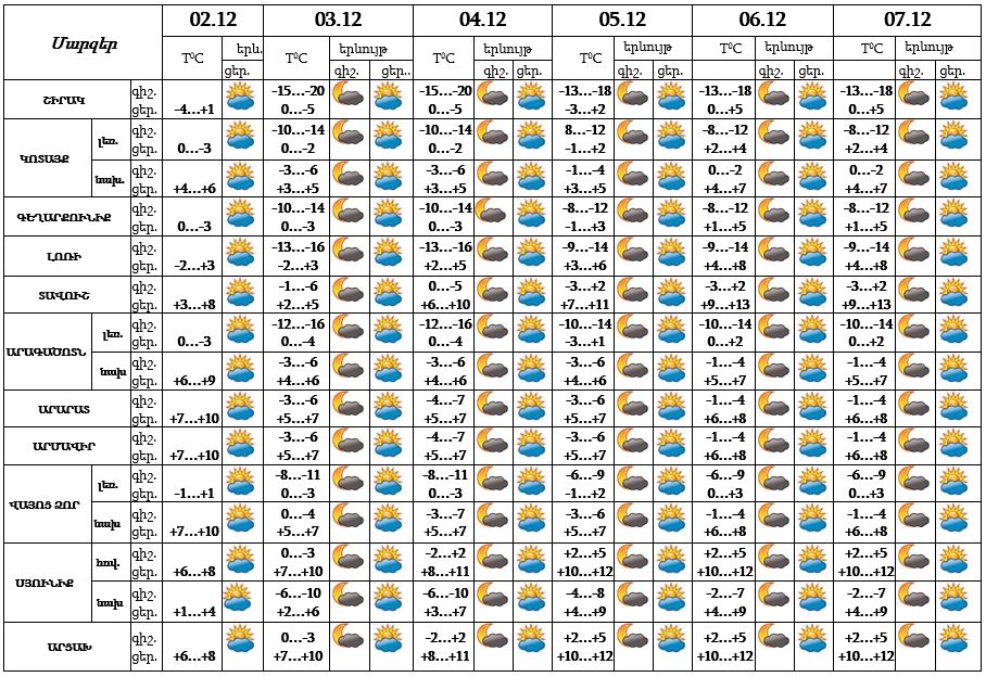 Դեկտեմբերի 2-ի ցերեկը, 3-7-ը սպասվում է առանց տեղումների եղանակ, գիշերը և առավոտյան լեռնային և նախալեռնային գոտիներում ճանապարհները կպատվեն մերկասառույցով: