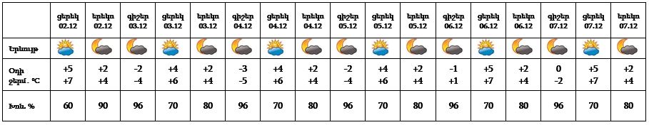 Դեկտեմբերի 2-ի ցերեկը, 3-7-ը սպասվում է առանց տեղումների եղանակ: