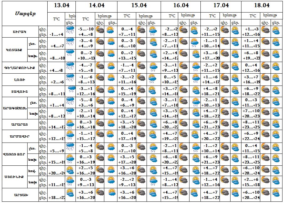 Օդի ջերմաստիճանն ապրիլի 13-ի ցերեկը կնվազի 10-13 աստիճանով, 14-17-ն աստիճանաբար կբարձրանա 6-8 աստիճանով։