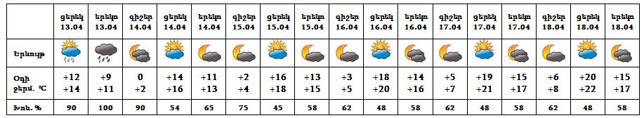 Ապրիլի 13-ի ցերեկը, 15-16-ի ցերեկն առանձին շրջաններում սպասվում են տեղումներ, 13-ին լեռնային շրջաններում` թաց ձյան և ձնախառն անձրևի տեսքով: Ապրիլի 14-ին, 15-16-ի գիշերը, 17-18-ը սպասվում է առանց տեղումների եղանակ:
