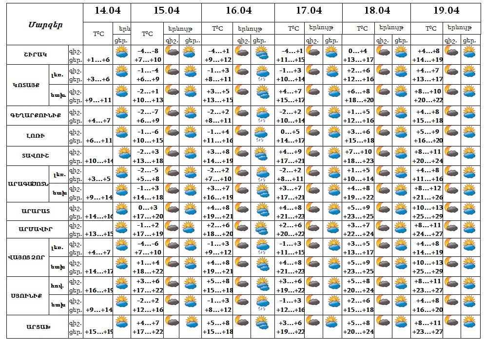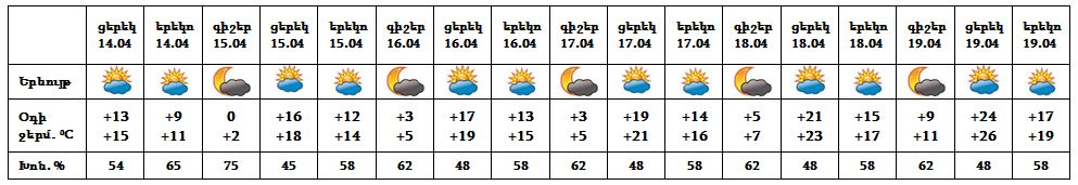 Ապրիլի 14-ի ցերեկը, 15-ին, 16-ի գիշերը, 17-19-ը սպասվում է առանց տեղումների եղանակ: Ապրիլի 16-ի ցերեկն առանձին շրջաններում սպասվում է կարճատև անձրև: