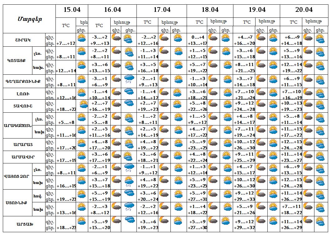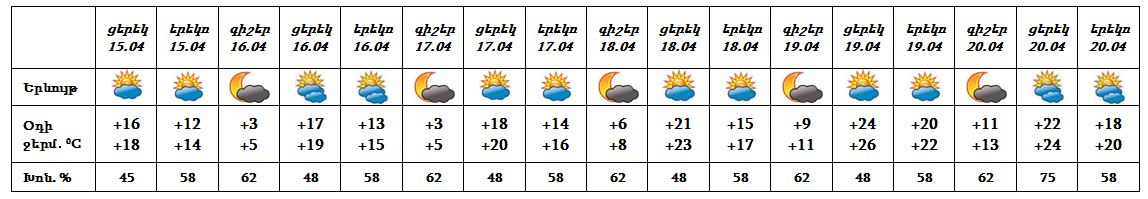 Ապրիլի 15-ի ցերեկը, 16-20-ը սպասվում է առանց տեղումների եղանակ: Ապրիլի 20-ին սպասվում է քամու ուժգնացում՝ 14-17 մ/վ արագությամբ: