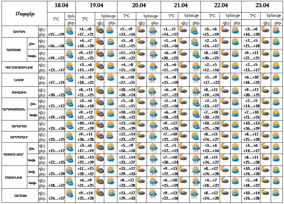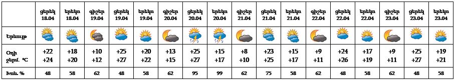 Ապրիլի 18-ի ցերեկը, 19-ին, 21-23-ը սպասվում է առանց տեղումների եղանակ: Ապրիլի 20-ի կեսօրից հետո սպասվում է կարճատև անձրև և ամպրոպ, ամպրոպի ժամանակ՝ քամու ուժգնացում՝ 14-17 մ/վ արագությամբ: