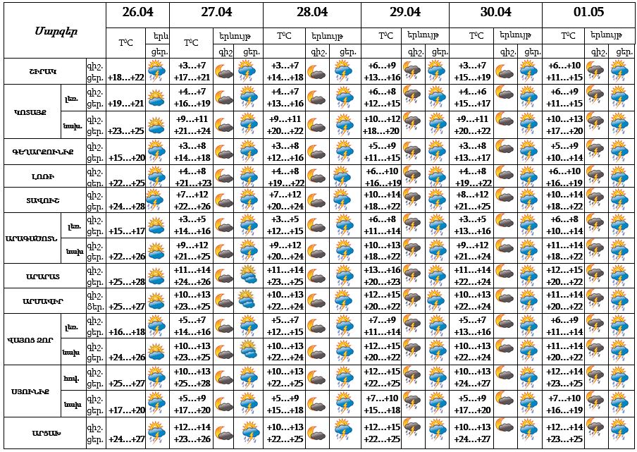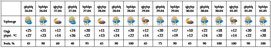 Ապրիլի 26-ի և 27-ի երեկոյան ժամերին քաղաքի առանձին հատվածներում հնարավոր է կարճատև անձրև և ամպրոպ, 28-29-ը, 30-ի ցերեկը, մայիսի 1-ին ժամանակ առ ժամանակ սպասվում է անձրև և ամպրոպ, ամպրոպի ժամանակ՝ քամու ուժգնացում՝ 15-18 մ/վ: