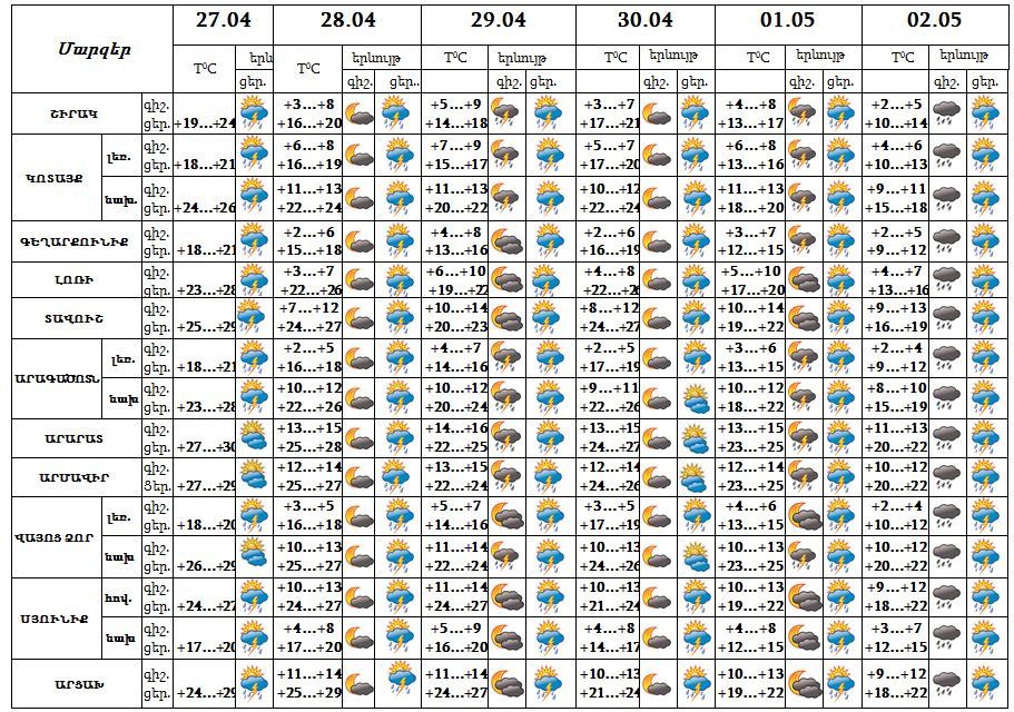 Ապրիլի 27-ի, 30-ի ցերեկն առանձին շրջաններում սպասվում է կարճատև անձրև և ամպրոպ, 28-ի կեսօրից հետո, 29-ը, մայիսի 1-2-ը ժամանակ առ ժամանակ շրջանների զգալի մասում սպասվում է անձրև և ամպրոպ: Ապրիլի 28-ի և 30-ի գիշերը սպասվում է առանց տեղումների եղանակ: